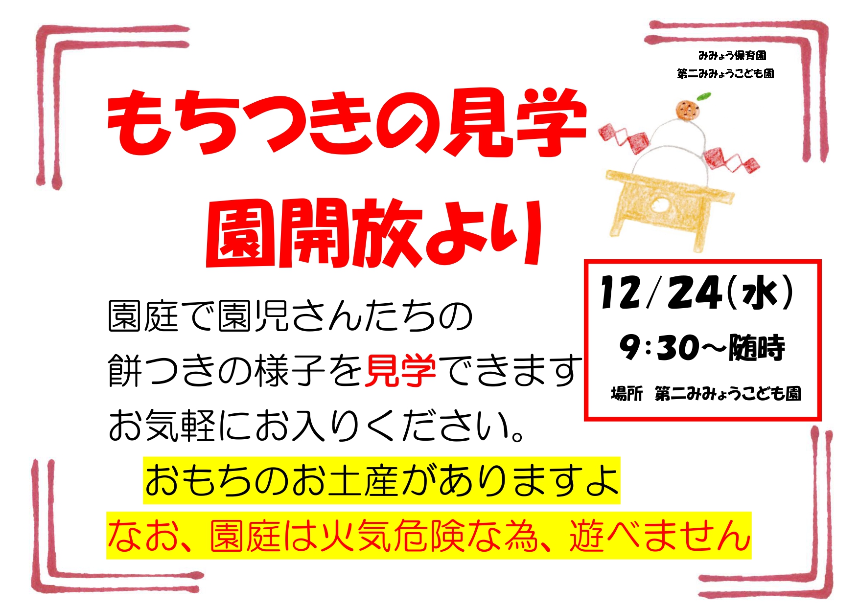 園開放 おもちつきの見学 画像はタップすると拡大できます。動画は動画右下の四角い枠でフルスクリーン表示されます。 12月24日(水)におもちつきがあります。 園庭で園児さんたちの餅つきの様子を見学できます お気軽にお入りください。 おもちのお土産がありますよ