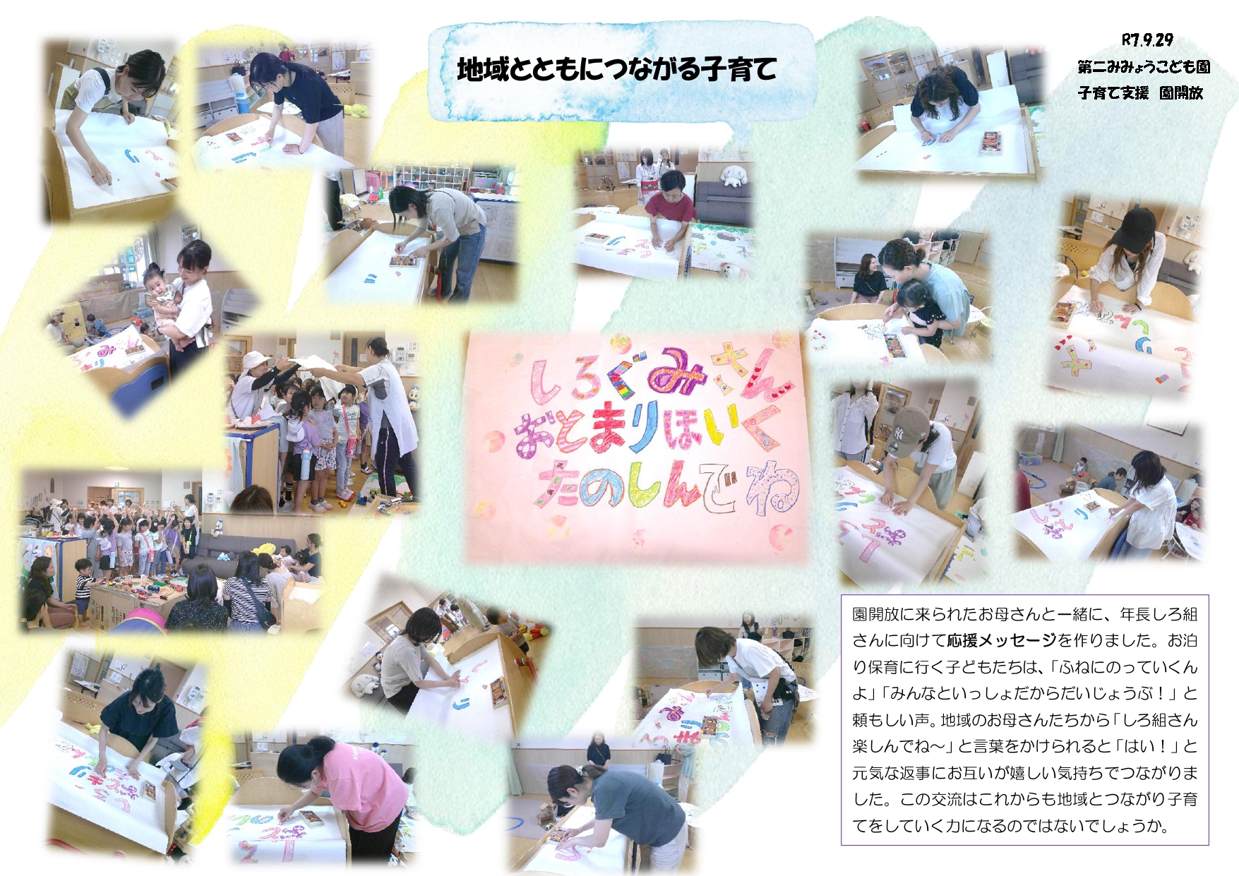 園開放 地域とともにつながる子育て 画像はタップすると拡大できます。動画は動画右下の四角い枠でフルスクリーン表示されます。 園開放に来られたお母さんと一緒に、年長しろ組さんに向けて応援メッセージを作りました。