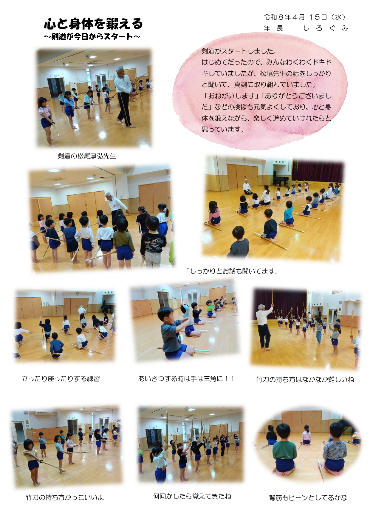 お知らせ 心と身体を鍛える 画像はタップすると拡大できます。動画は動画右下の四角い枠でフルスクリーン表示されます。 ~剣道が今日からスタート~ 心と身体を鍛えながら、楽しく進めていけれたらと思っています。